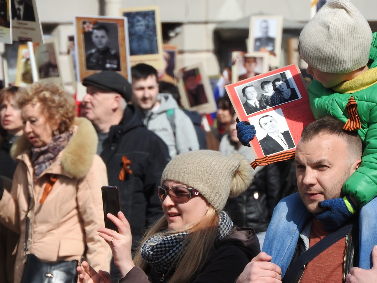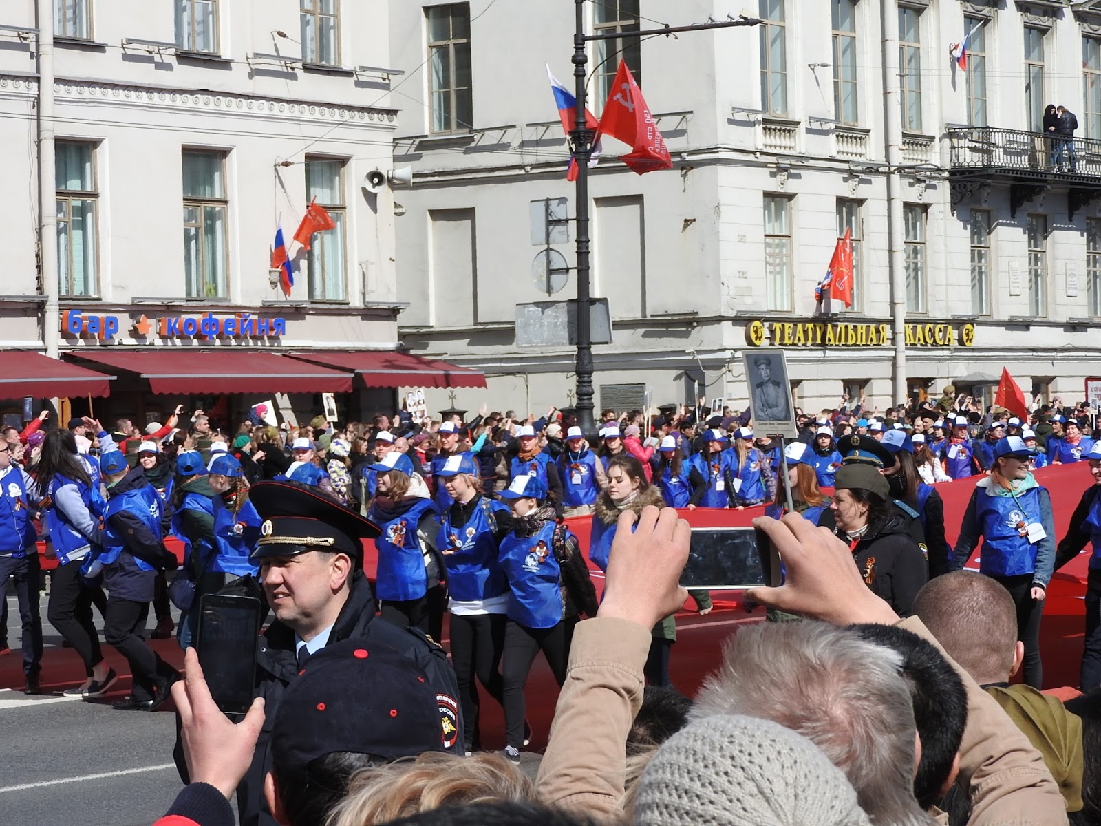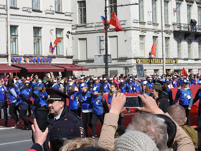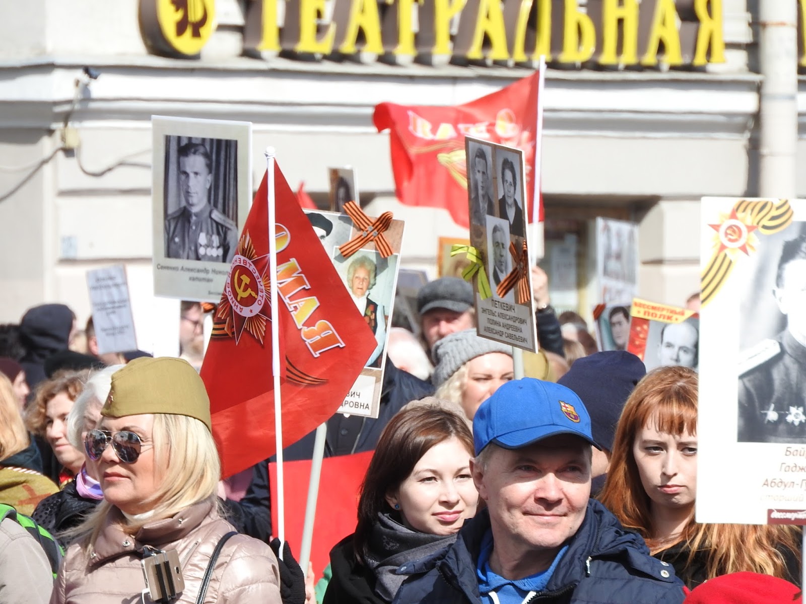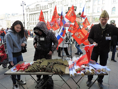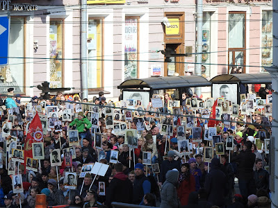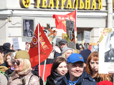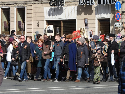Как проходит 9 мая в Петербурге Выбралась на Невский посмотреть на шествие и заодно узнать, изменилась ли "повестка". В нулевые в Петербурге 9 мая справлялось просто - перекрывался Невский, шел военный оркестр, ехали ветераны на полуторках, потом шли блокадники и всё. Вечером салют. А вообще с 1-го по 9 мая в основном народ уезжал обустраивать дачу. С 2013-го у нас проходит Бессмертный полк. В этом году заметно меньше ленточек на улицах. Наверное, потому, что их не раздавали. Я видела только один раз, позавчера у метро. Но это просто на прохожих и машинах, а сегодня в колоннах их довольно много. И теперь их не носят как попало, а по большей части в соответствии с недавней инструкцией. Я думаю, это само так вышло, а не потому, что её все читали. Но символы праздника немного изменились. У метро, когда пошла колонна, развернулась торговля флагами и пилотками. Пилотки же раздавали каким-то своим восточные люди, да и самих представителей гастарбайтерского племени в пилотках было много. Флаги (50 рублей) и пилотки - основной вид сувенирной торговли. По всей видимости, полулегальной, поскольку торговцы флагами старались в объектив не попадать. Шествие началось в 3 часа, зевак не очень много, но у нас еще и жутко холодно - +3. Впереди шли какие-то "Наши" нового разлива - молодые люди в синей форме. А вот за ними под транспарантом "Мы победили, потому что были вместе" шли представители "братских народов" в концертных национальных костюмах. Диаспоры, наверное: За ними казаки: А потом уже и мирное население: Шествие было разбито на отдельные колонны, в которых шли представители каких-то косплеерских объединений: Косплееров времен Вов было мало и они всей группой потом ушли к метро: Потом я замерзла и убежала греться. Но уже на подходе к Сенной застала тех, кто дошел до Дворцовой и по Гороховой двинул к метро Сенная размахивая фотографиями родных. По наблюдениям: МЗС по привычке на общественное начинание нахлобучивает свою идеологию, но теперь вместо "путина" это многонационалия. По совпадению в маршрутном автобусе по дороге случился конфликт между пассажиром и водилой из-за мальчика с велосипедом, которому водила не открыл среднюю дверь. За что ему нагорело и было сказано, что "русские люди таким как вы работу дают". Мальчику дверь открыли и конфликт иссяк. В официальную моду всё больше входит косплей хоть в какой форме, хоть военный (как минимум пилотки), хоть национальный. Ленточки что-то действительно разлюбили и замещают их флажками и значками. Народ в акции участвует охотно пока её, слава богу, не зарегулировали. Ну и всё. Ничего такого. У нас город провинциальный, никаких этих столичных креативов. Но очень холодно. |