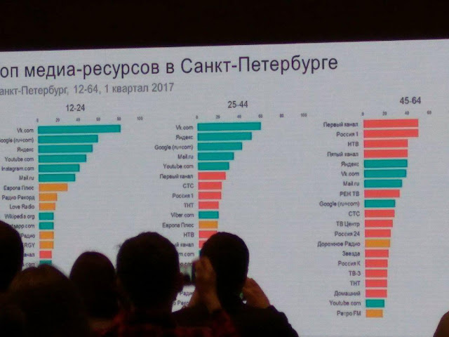 Как вы понимаете, с каждым годом вот эти полосочки будут сдвигаться слева на право. Потому что люди пользуются по инерции теми источниками, к которым привыкли с молодости. И если человек уже вырос на интернете, то он будет пользоваться им и дальше до старости. А то бытует такое представление, что вот в 45 он выключает компьютер и резко включает телевизор. Но этого не происходит. И если правую колонку разделить еще на два сегмента - 45-54 и 55-64, то окажется, что в 45-54 телевидение будет на третьем-четвертом месте, а на первом уже ВК и Одноклассники, которых я почему-то не вижу, кстати, в таблице, как не вижу Твиттера. А реальное телецарство начинается уже у тех, кто ближе к 60-ти.