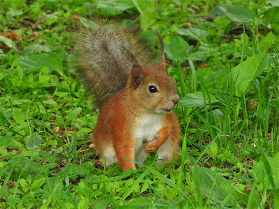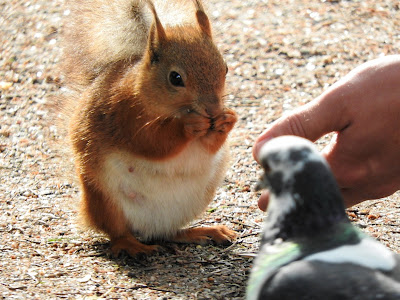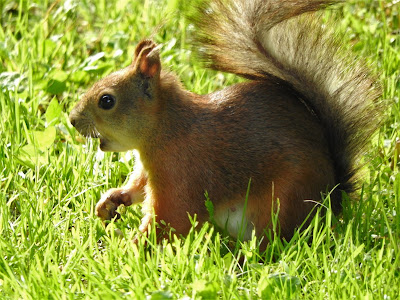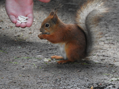 На Крестовский остров мигрировали белки с Елагина. Но на Елагином белки гордые, а тут они быстро смекнули, что еда происходит от чудищ, и попрошайничают только так. Видят человека и тут же сбегаются поинтересоваться, нет ли чего.