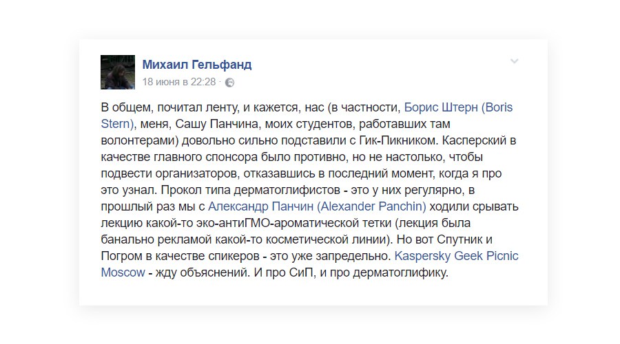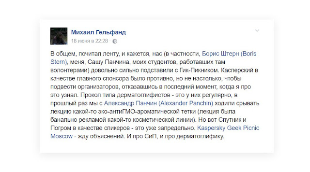 Очередная чистка рядов В Фейсбуке скандал в благородном семействе. На московский Гик-пикник, который был в прошлые выходные, пригласили Егора Просвирнина, чтобы он рассказал про СиП. Общественность возмутилась. Мало того, что спонсором пикника в этом году стал Касперский (сразу вспоминается Министерство Обороны и фестиваль "Нашествие"), так теперь еще и националистов позвали. Возмутился Михаил Гельфанд и Ася Казанцева и пошла волна. Мол, нельзя звать человек с такими политическими взглядами, а если вы и в Петербург его позовете (у нас пикник в эти выходные), то мы отказываемся у вас выступать и срывать чужие антинаучные лекции. Кто-то в общем крике спросил, а с чего СиПу там вообще быть. Какое отношение он имеет к гик-культуре? Но Гик-пикник и сам-то не имеет к ней никакого отношения. Это косплей. Два года хожу и два года никаких изменений: гибрид "Афиши-Еды" и фестиваля игр на свежем воздухе. Я не знаю, в чем дело. На Хаос Констракшенс есть гичий дух,там гиком пахнет, на Старконе есть, а тут нет. Вчерашние хипстеры изображают духовную жизнь - популярная лекция о якобы науке, игра в городки, дорогие бургеры и крафтовое пиво. Как торгующие там рестораторы клеят портрет Спока и вот уже не сеть "Две палочки", а... Да всё та же сеть "Две палочки". Просто не надо обманываться - это хипстерское мероприятие. Но вот что удивительно: даже этот праздник живота умудрились политизировать. Даже тут обнаружились какие-то свои и чужие. И если бы Просвирнин выступал не как отец-основатель интернет-издания, а как старый геймер, его бы всё равно прогнали какие-то более идеологически выдержанные геймеры? Ну ок, они там не разделяют его взглядов на политику, я сама их не разделяю и на журналистику тоже, но про игры-то можно говорить "не членам партии"? Можно ли обсуждать монетизацию с другими монетизаторами вне их политических убеждений? Прилично ли говорить об этом с порнографами? В конце концов, дозволено ли пригласить на Гик-пикник коммунистку поговорить об образах ангелов и вампиров кинематографе? А если это Тильда Свинтон? Можно ли звать противника высшего образования выступить с лекцией о научной фантастике? А если это Питер Тиль? И так далее. Мало ли кому что не нравится. Мне лекции Казанцевой кажутся безобразными, так и что с того? Это дело организаторов звать или не звать и кого звать. |
