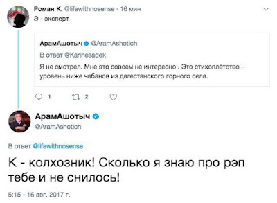 Хроники безумия Онищенко: «То, что государственные СМИ раскручивают её – это, конечно, с их стороны безответственно. Отсутствие профессионализма с точки зрения тех денег, которые им даёт государство. Я понимаю, какие-нибудь оппозиционные СМИ пишут об этом, но они живут по своим законам. Для государственных СМИ это недопустимо. Работодатель государственных СМИ должен их спросить, они должны ответить и перед Старой площадью, где есть соответствующие структуры. Да, нужно менять законодательство. Спрашивать с тех, кто его нарушает, не просто пожурить, поругать, а более серьёзными вещами. В ролике убогий язык, законы русской разговорной речи, культуры там даже и близко не ночевали. Интернет сегодня отражает ту убогость духовную, которая есть в нашем обществе, раз это находит такой широкий отклик. Там, по-моему, в течение ночи 3 миллиона было просмотров, и все с гордостью об этом сообщали. Особенно бесстыдно вели себя государственные каналы». Венедиктов: АрамАшотыч: Как было замечено, стоило МЗС уйти в отпуск, как новостную повестку заполнили Действительно Важные Вещи. Вы в курсе, что 6-ю серию GoT слили, кстати? Я уговорила себя не смотреть до воскресенья, но на улице так жарко, а серия такая интересная... |