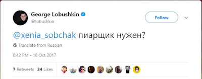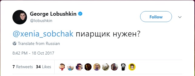Приятные молодые люди Георгий Лобушкин, бывший пресс-секретарь ВКонтакте, а затем кто-то там по стратегическому чему-то в Мейл.ру, присоединился к Игорю Малашенко и Тимуру Валееву в штабе Ксении Собчак. Теперь Лобушкин будет вести эккаунты Ксении в соцсетях. Кроме Инстаграма и Твитера, которые она не отдаст никому, они ей самой нужны - она с них кормится. Парад засранцев продолжается! Всё как с Прохоровым! |