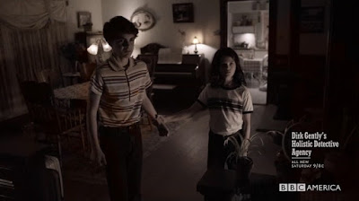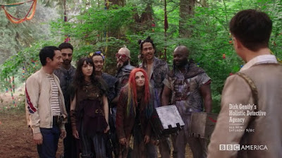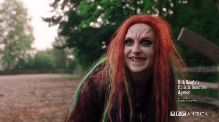 Dirk Gently's Holistic Detective Agency - 8-я серия (2) рекап В прологе опять 1966 год, Кардинасы ссорятся из-за продажи фермы и жена убивает мужа ножницами на глазах у Арнольда. Но труп видит и второй мальчик, он теряет сознание, ножницы и тело исчезают, а машина с его приемной матерью уносится в небо. В наше время дом оцеплен людьми из Черного Крыла. Они нашли портал, который ведет в "дом внутри дома", поймали Фиолетово-Людоедо-Монстра, но так и нашли вход в Вендимор. Кен, который теперь не официально за главного, спрашивает у бедного, ничего непонимающего Фридкина, знает ли он что-нибудь о проекте Ламия. Проект Ламия - это человек или сущность, известная под именем Мона Вайлдер, может принимать любые физические формы. Она шесть лет пробыла креслом. Она вообще предпочитает быть неодушевленным предметом, но в этом состоянии она постепенно забывает, кто она, и нужно что-то, что выведет её из этого состояния. Кен показывает Фридкину записи, на которых у резиновой игрушки, которую я упоминала в прошлых рекапах, меняется цвет глаз. Как он это увидел, непонятно, потому что запись черно-белая и мелкая. Дёрк в это время бежит по лесу от Кикиморы, видит грузовик компании Келлум и спасается от своей гёрлфренд в проезжающей повозке, которая доставила его во владения Денгдаморов, где готовятся казнить Тодда и Аманду. Тодд в тюрьме рассказал сестре, что у него тоже парарибулит. Она же встречно рассказала, что в этом мире парарибулит работает иначе и не надо есть таблетки, галлюцинации можно превратить в оружие. Они попробовали вызвать приступ, надавав друг другу по лицу, но безрезультатно. Они не знают еще, что Дёрк здесь и пытается их спасти. А его как раз догнала Кикимора. Он опять побежал от неё в лес, где встретил Дебоширов, которые как раз разыскивают Аманду. Обменявшись любезностями, они сошлись на том, что Аманду надо спасать, а Дёрк будет в этом деле за главного, потому что у него есть план. Они въехали в Денгдаморск на грузовике Келлум и устроили там безобразие. И Кикимора с ними. Захватив по случайности Сайласа и освободив Тодда с Амандой, все умчались прочь, в лес. Там Дёрк рассказал всем, что же произошло с Кардинасами и откуда взялся Вендимор. В общих чертах мы м так всё знаем: Кардинасы нашли ребенка на корабле в поле и взяли его к себе, но вскоре выяснилось, что этот мальчик во сне может создавать другие реальности и материализовать разные вещи из своих видений. Странными явлениями заинтересовались спецслужбы, Марина Кардинас решила продать ферму, не спросив мужа, в ссоре она убила его, Мальчик отправил их кого куда - тело отчима в дерево, а мачеху на машине на дерево. Арнольд остался один с братом и он позвонил по телефону, который ему оставили правительственные агенты, и те забрали Мальчика. А он от всего этого - потери родителей и явления спецслужб - реализовал свою фантазию, которую когда-то нарисовал на стене - Вендимор. Он буквально, как бог, создал новый мир. Это вызвало скачок энергии, о котором говорил шериф. Сам Мальчик впал в кому. А созданный им мир без своего создателя начал съезжать в хаос. Вот почему надо парня вернуть сюда. А главное, Дёрк знает, где этот мальчик - это проект Молох и он находится в Черном Крыле. Еще они догададись, что Мона Вайлдер как-то связывала два этих мира. А Дебоширы напомнили, что Аманда может перенести туда и оттуда, как она сделала с ними.