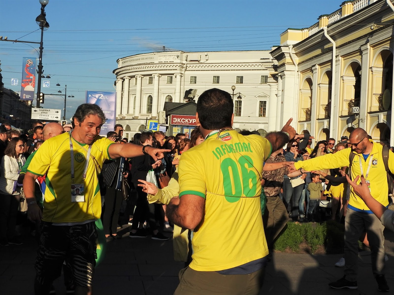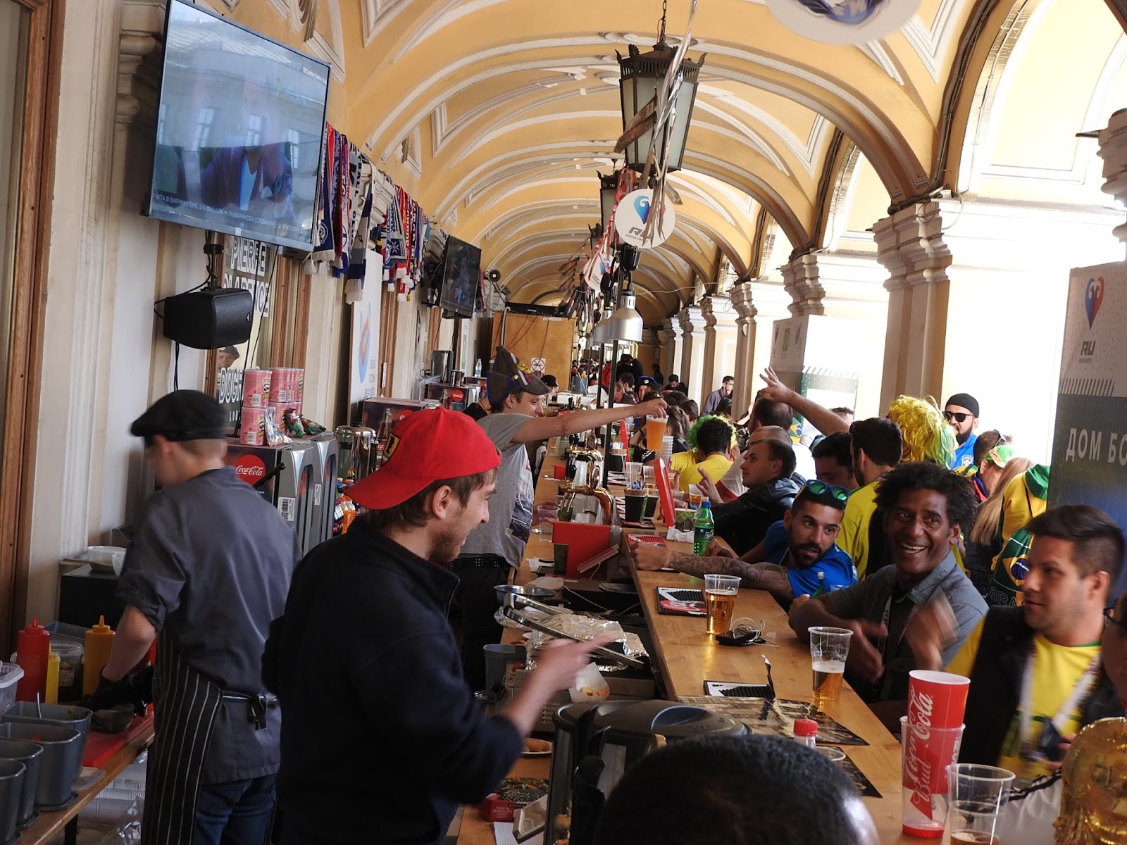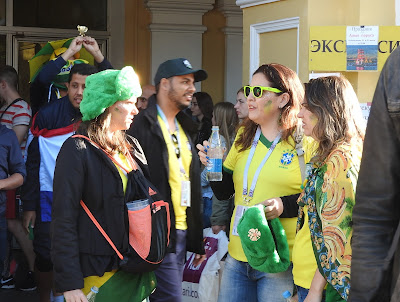 И о футболе - ч.3 Разноцветные ушанки - хит футбольной моды. Кстати, у барышни слева в кармане рюкзака те самые стаканы (их два вида - прозрачные с рекламой Bud и красные Кока-Кола): Из удачных городских мер - бар на невской линии Гостиного Двора. Неряшливый, дорогой, но вообще там надо такое на лето устраивать, да и вообще отдать невскую линию под кафе, а торгуют всякой ерундой. А за углом уже тишина: Кубок уже выиграла Бразилия. И опять стаканы: Болельщики: А потом наступила ночь и я пошла домой: |
