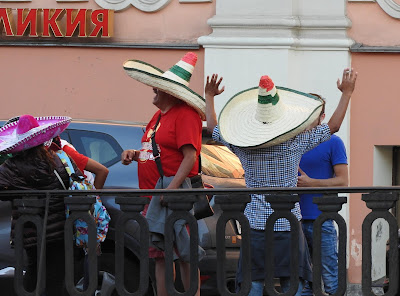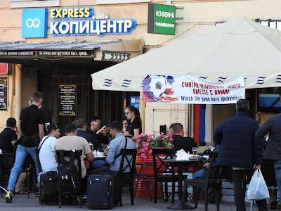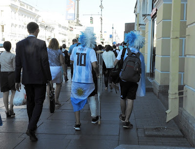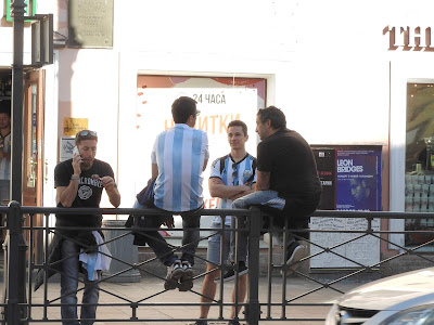 И снова о футболе Вчера у нас играла Аргентина с Нигерией, я прошлась по городу, и хотя болельщиков довольно много, в основном аргентинцев, моё старое наблюдение подтвердилось - интерес к большому спорту, даже к зрелищному, и даже к футболу у населения упал. Конечно, всюду бегают "месси". А эти уже добегались: И даже "не месси": Но в барах пустовато. Две туристки зашли в "Большую кухню" на Невском со словами "У нас забронирован столик. Когда начнется трансляция?", но в зале полно свободных столов, а девочки за стойкой не знают, когда начало. Бар на Гороховой, начало матча: На Сенной туристы смотрят футбол в затрапезном "Чайникоффе" прямо с вещами: В пабе "Лондон" в зале шесть человек перед телевизором, все русские. А ведь там гостиница в двух шагах. Хард Рок Кафе на три четверти пустое, и это во время трансляции: Никаких воплей из окон, как раньше, никаких тусовок в наших районных заведениях, куда набивалось народу битком, хотя футбол смотрят в транспорте по смартфонам. Город живет своей жизнью, несмотря на чемпионат. Местное: Из хорошего вот это: Да, грязно, но люди старательно складывают мусор в урны. И так по всей Садовой. В Пятерочке кассир, мужчина около сорока, жалуется, как хорошо, когда был день без алкоголя (это на Алые Паруса), а сегодня как с цепи сорвались, ведь так было здорово, когда все трезвые. Энтузиазм и праздник - это в Москве. А у нас вот так: Но в столовую очередь: |
