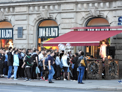 Россия-Хорватия Собираться смотреть стали загодя: Если в фанзону на Англию-Швецию я прошла спокойно, правда, не со стороны Спаса на крови, а со стороны Марсова поля, то к семи часам туда выстроилась очередь вдоль всего Михайловского сада и завернула на Садовую. Во всех возможных кафе обосновались люди в шапках и с полосатыми лицами. Матч начался. Прохожие на Невском смотрят футбол: Где-то образовались целые толпы, хотя телевизоры выставлены на улицы почти везде, и даже на Дворцовой: Я очень удачно вписалась в Столовую и даже получила козырное место, а когда я пошла за пивом, мне добрый болельщик еще предложил своё за другим столом. Экспрессивный парень в начале закричал на весь зал "Ну что за хуйня!", тогда другой подошел к нему и тихо попросил не кричать таких слов. И он согласился. А потом все радостные вышли на улицу и дудели в свои дудки. |