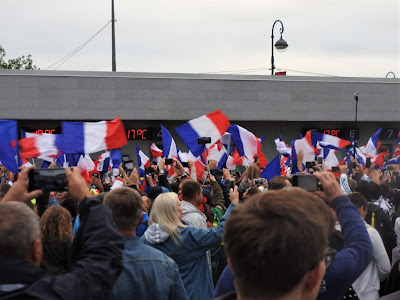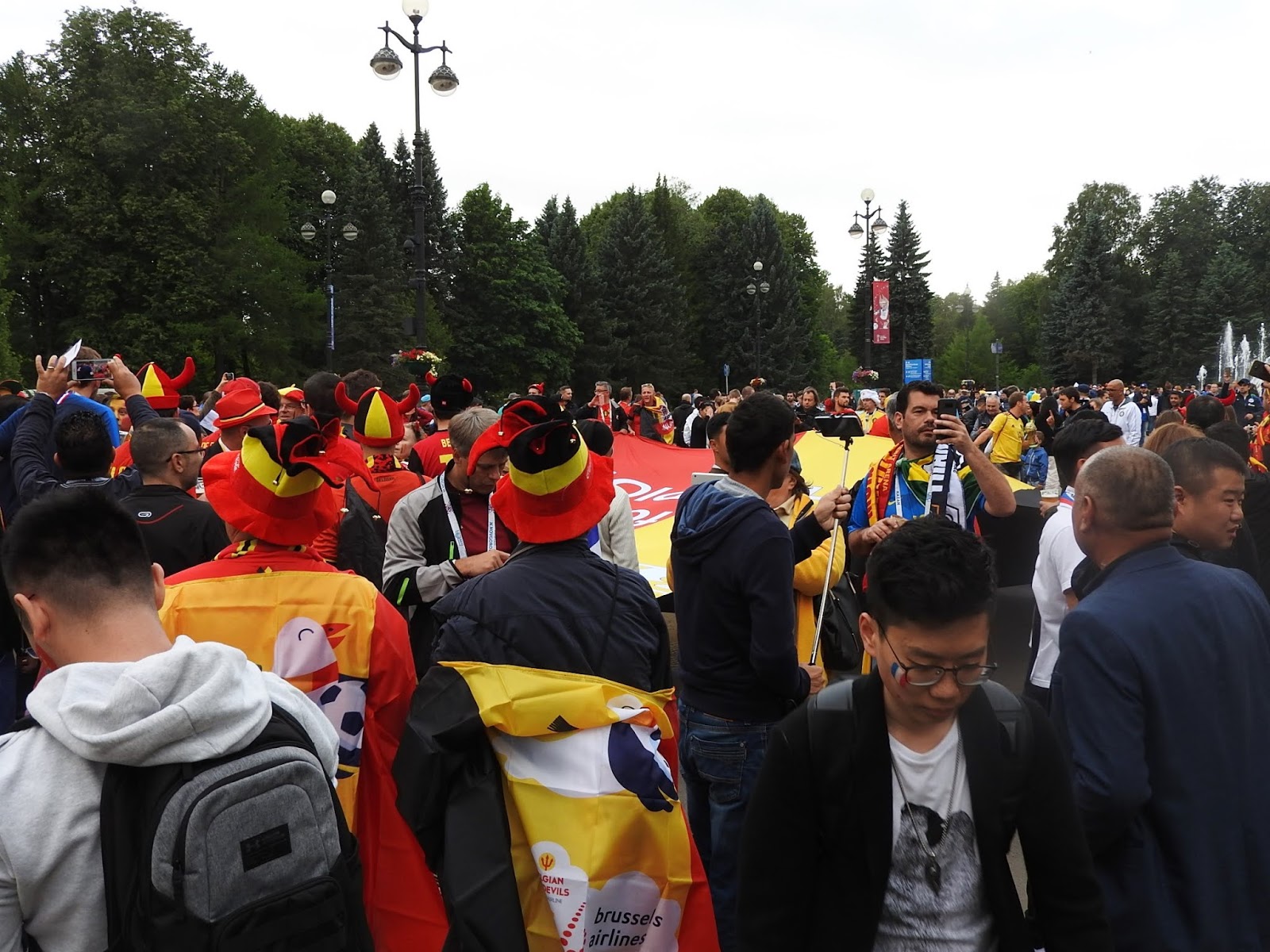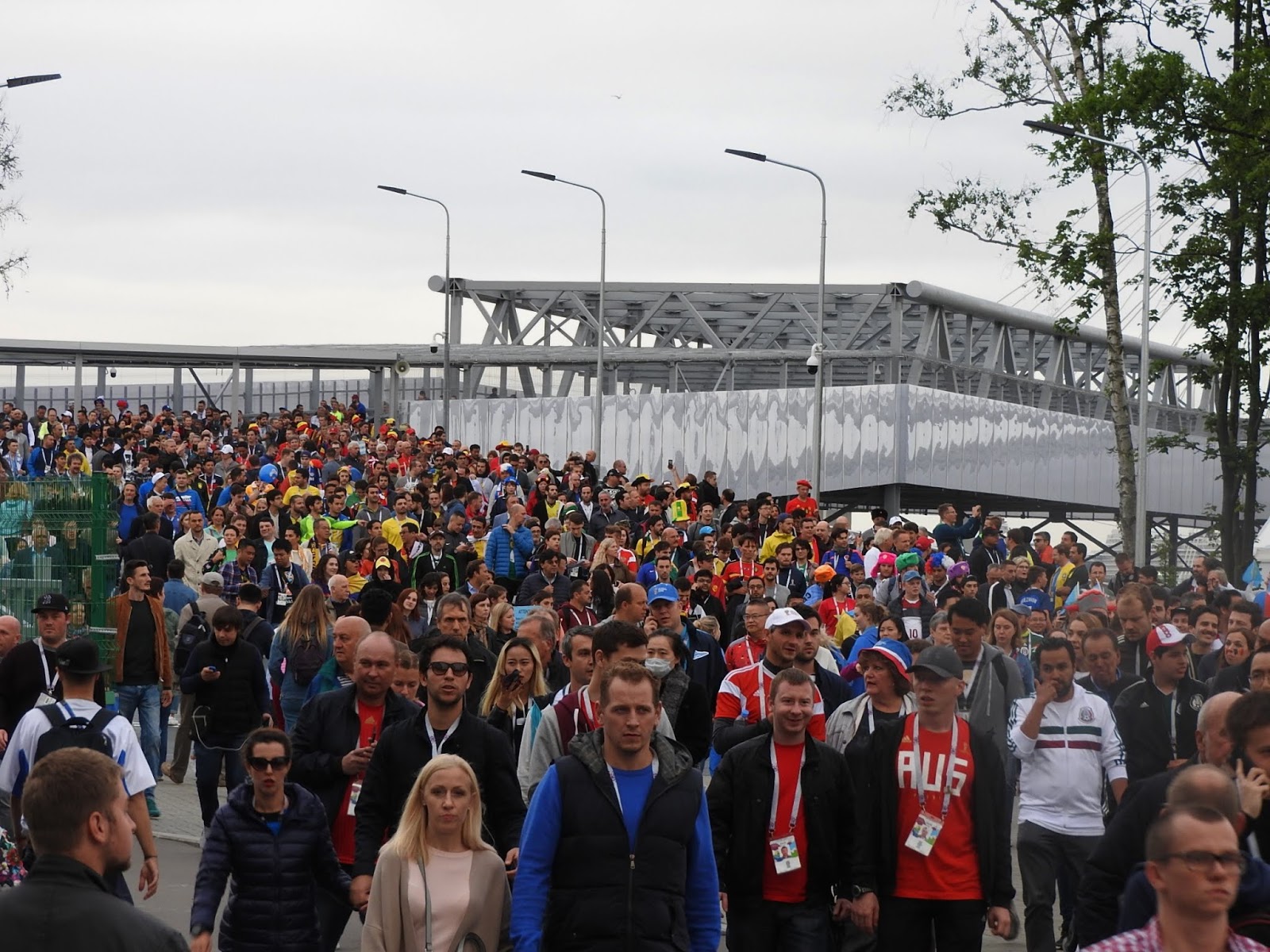 Франция-Бельгия: перед матчем В этот раз я проделала путь болельщика - доехала с ними от Сенной до Крестовского, прошла до стадиона и оттуда уже вернулась с Новокрестовской до Невского и пошла в фанзону со стороны Марсова поля, потому что там народу меньше (маленький лайфхак). Французы: На Сенной как раз в метро грузилась колонна бельгийцев с песнями, но их быстро загрузили в поезд, так что особой давки не было. Дальше они двинулись к стадиону. Под присмотром парковых служб и полиции: Объявления в парке через громкоговорители были на двух языках - на русском и французском. Маленькая вроде деталь, но вот организаторы позаботились, чтобы объявы были на языке участников матча. Волонтеры разных возрастов: У стадиона полицейский объяснял болельщику, как проехать в аэропорт, по-английски: Встретила уже знакомых болельщиков из Казахстана, их целый десант, оказывается. Их товарищ в возрасте скакал перед метро с флагом и кричал "Шымкент!", рекламировал так свой футбольный клуб. А это узбекская делегация, везде фотографировалась с флагом. Их на самом деле человек десять было: Я уж чуть было не решила, что французов и нет почти, но основная толпа приехала на Новокрестовскую (станцию построили специально к чемпионату). В каком-то видео услышала от заезжего журналиста, что "стадион находится в стороне от города", он вообще-то не просто в пределах города, а от Невского проспекта в трех остановках метро если до Новокрестовской, и в пяти, если до Крестовского острова: Тут-то французы и выстроились в колонну и с песнями маршировали к стадиону: Народу очень много, но давки нет, чисто, никто мусор не бросает, везде баки для раздельного сбора. Полиции и омона, мне показалось, даже меньше, чем перед местными матчами. Но скорей всего, они просто затерялись в толпе. В общем, вот как-то так. |