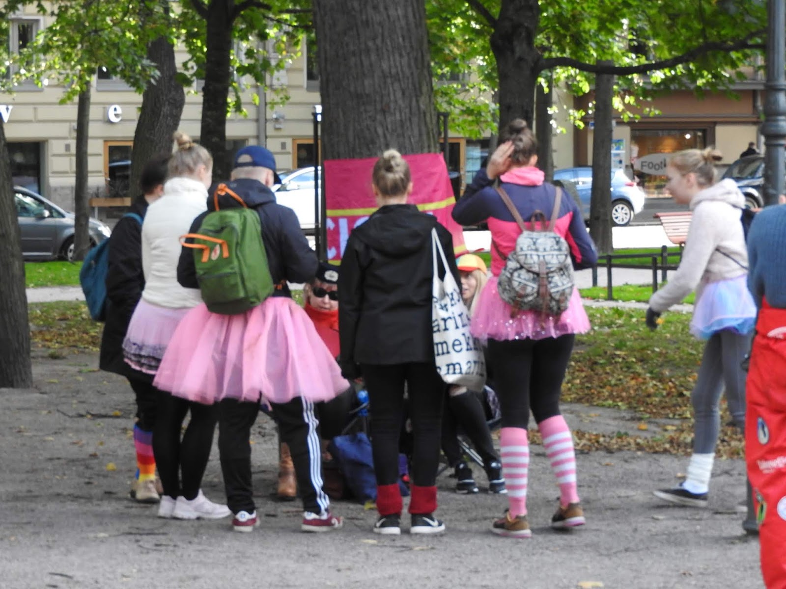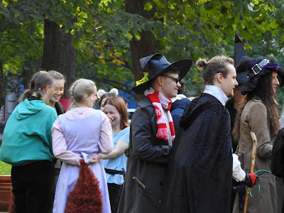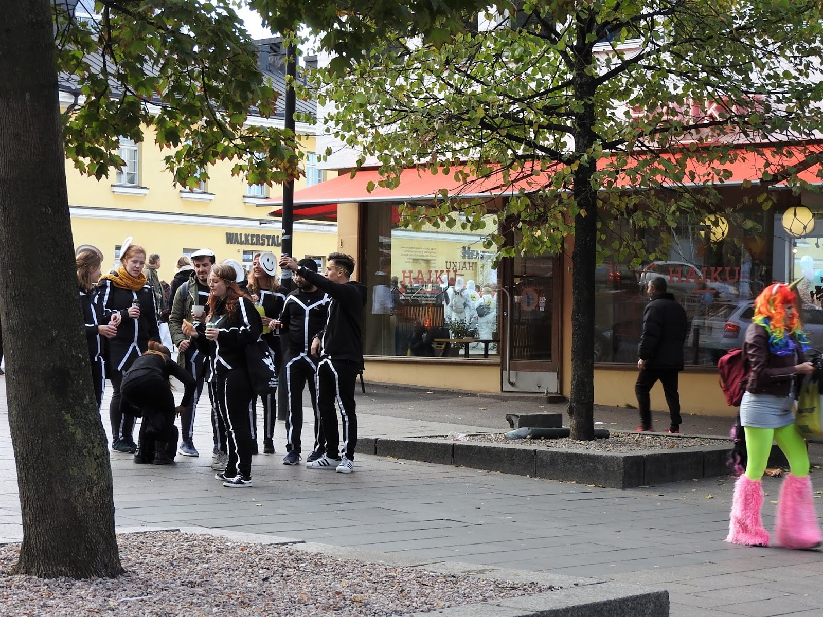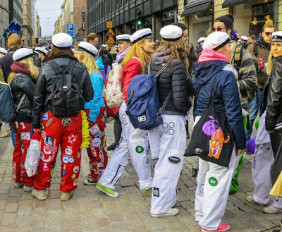 Хельсинки: студенты После обеда на улице стали попадаться компании молодых людей в костюмах. Хотя магазины уже завалены разной хэллуинщиной, до Хэллуина еще далеко. Зеленые штаны на девушке справа намекают, что это студенческий праздник. Так оно и оказалось. Такие штаны в нашлепках, а вообще-то комбинезон в комплекте с фуражкой с козырьком - традиционный праздничный студенческий наряд в европейских и особенно шведских и финских университетах. Вот картинка из интернетов - хельсинские студенты в канун Пасхи, когда у них очередной праздник: Здесь в таких штанах бегала группа поддержки: Оказалось, это было ежегодное мероприятие для первокурсников, которое по-английски называется Fresher Adventure и организуется студенческим союзом. Такой командный квест с вечеринкой в финале. Вот тут в ФБ галерея участников этого года и есть команды, которые я встретила, и даже одна русская. Вот парни в розовом идут на чекпойнт, а девушка в желтом жилете тоже из команды. А вообще главные студенческие праздники весной, когда они маршируют в своих комбезах. |