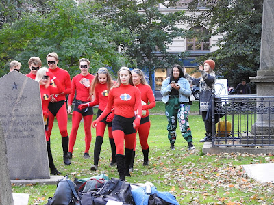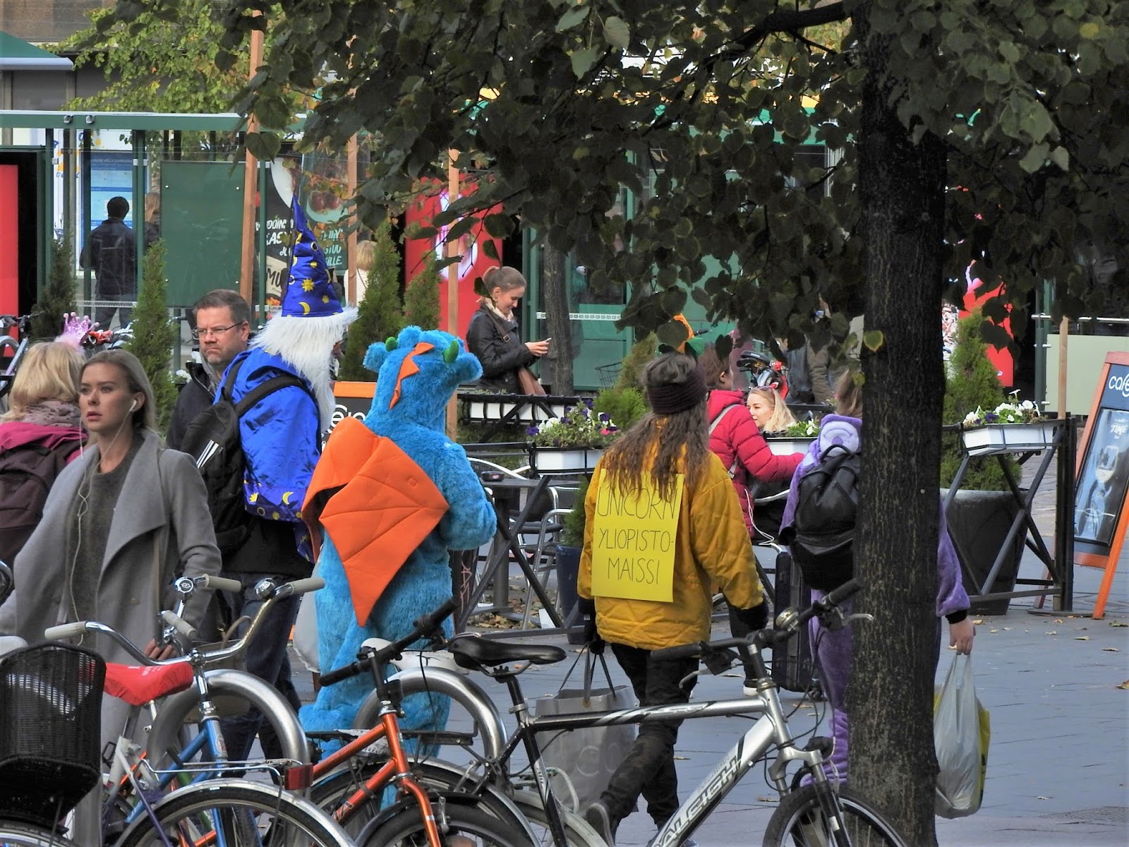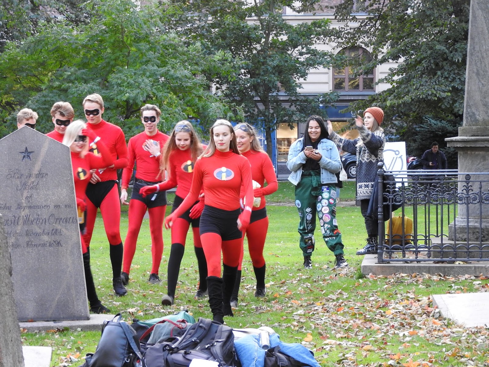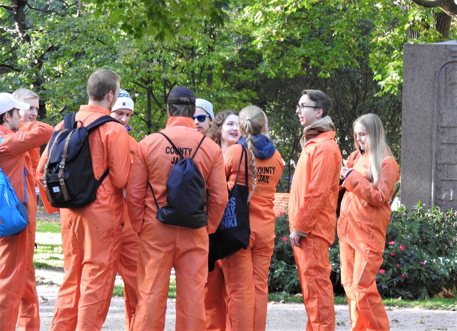 Хельсинки: студенты После обеда на улице стали попадаться компании молодых людей в костюмах. Хотя магазины уже завалены разной хэллуинщиной, до Хэллуина еще далеко. Зеленые штаны на девушке справа намекают, что это студенческий праздник. Так оно и оказалось. Такие штаны в нашлепках, а вообще-то комбинезон в комплекте с фуражкой с козырьком - традиционный праздничный студенческий наряд в европейских и особенно шведских и финских университетах. Вот картинка из интернетов - хельсинские студенты в канун Пасхи, когда у них очередной праздник: Здесь в таких штанах бегала группа поддержки: Оказалось, это было ежегодное мероприятие для первокурсников, которое по-английски называется Fresher Adventure и организуется студенческим союзом. Такой командный квест с вечеринкой в финале. Вот тут в ФБ галерея участников этого года и есть команды, которые я встретила, и даже одна русская. Вот парни в розовом идут на чекпойнт, а девушка в желтом жилете тоже из команды. А вообще главные студенческие праздники весной, когда они маршируют в своих комбезах. |