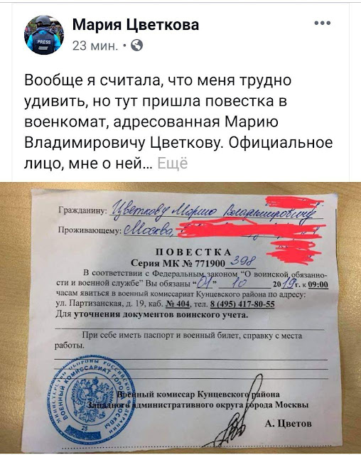 Журналистка Reuters Мария Цветкова после задержания на прошлом митинге получила повестку в военкомат (что там наши псевдо-сми писали - на митинге выявлены 100 уклонистов? Вот первый пошел):