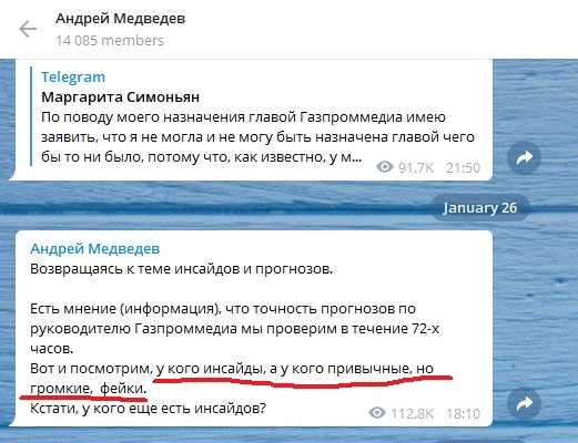 Портрет беспозвоночного Все знают про пост ведущего "Вестей" Андрея Медведева в день ареста Ивана Голунова про знакомого опера, мало кто помнит, что в этот день он переобувался в Телеграме раза три от "не может быть" до: "Я сам только что поговорил с Юрием Титовым, благо мы знакомы давно. Так вот по словам полицейских, фото сделаны именно в квартире Голунова. Он ее снимал. Это не та квартира, где он прописан. Информации у оперативников вообще собрано много. Доказать, что Голунов в квартире как минимум часто появлялся, а реально жил, я думаю, они смогут. Полагаю, что все материалы для закрепления доказательств, отпечатки пальцев, опрос соседей, собраны. Обычно розыск без этого не работает. Если это правда, если эти доказательства примет следствие и суд - это очень плохо. Потому что это удар по профессии, по сообществу. У меня нет оснований не верить Юрию Титову. Правда. Он не такой человек, чтобы сочинять басни на ходу. Вообще нет. " Он всё время оглядывался на Симоньян, в какую сторону она укажет, чтобы занять нужную позицию. Он вообще перед ней лебезит и пресмыкается. "Андрей Медведев, [07.06.19 21:44] Чистая правда, Рита. Согласен с тобой на сто процентов. Но надо быть готовыми, что ответы понравятся не всем. Чиновникам или журналистам, полиции или тем, кто говорит сейчас о полной невиновности. Я не знаю кому, но это точно будет. Слишком много и эмоционально все наговорили и написали за день." Вчера еще в сомнениях, на следующий день уже отпустить Голунова: "Я полностью согласен с Ритой. Ивана надо отпустить под домашний арест. Тем более если у него сотрясение и прочие тяжкие травмы. Да, и все вопросы, которые подвисли в воздухе, требуют ответа. Хотелось бы увидеть не только доказательства вины. Если они есть. Хотелось бы получить и оценку действий оперативников." К чему я вспомнила сейчас так подробно про эту галатурию. Когда меняли правительство и освободилась должность в руководстве Газпроммедиа, Медведев, конечно же, поддержал слух,что буквально на днях эту должность займет Симоньян (у неё в это время был квант-экстаз от Мишустина). "Посмотрим, " - говорит Андрей Медведев - "У кого фейки". В зеркало посмотри, головоногий! |