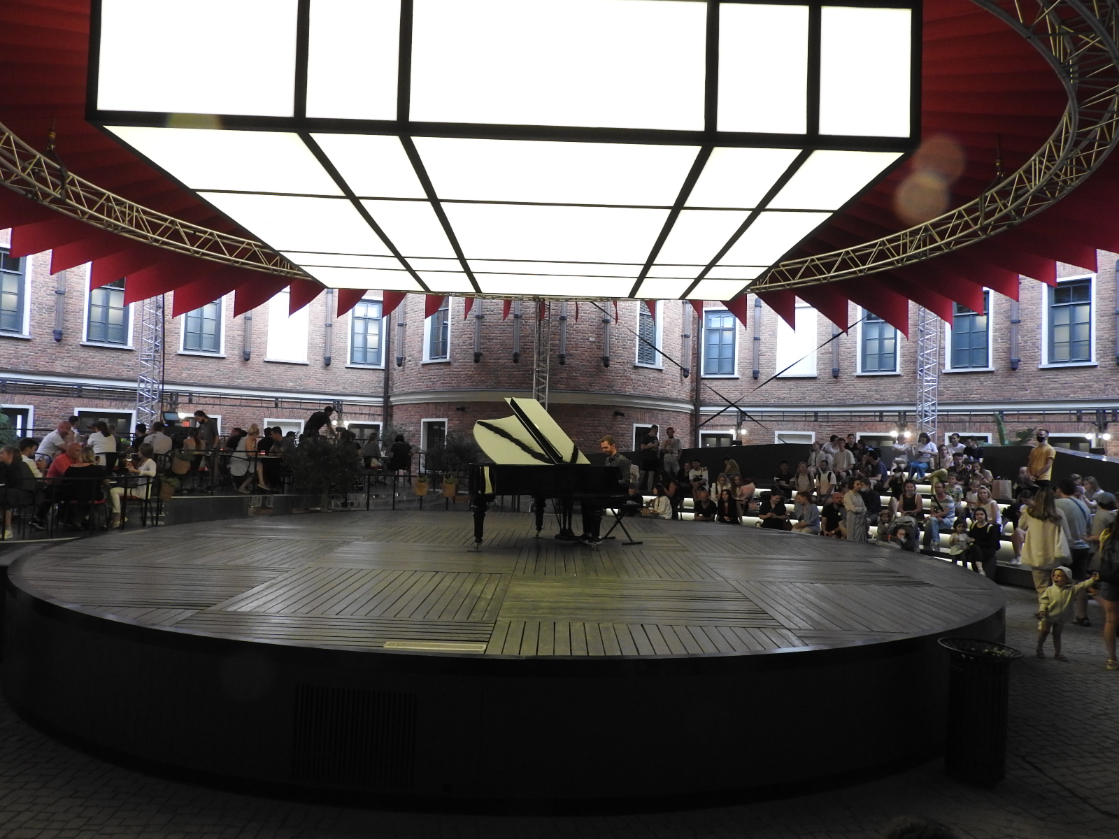 Под тентом в Хипстерятне. Когда он заканчивает пьесу, все аплодируют, такого успеха у него, наверное, не было никогда. А просто идет дождь: