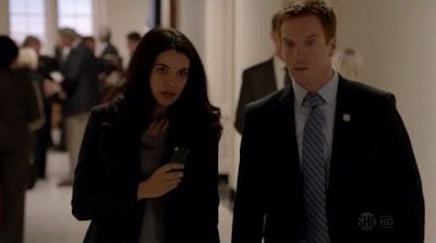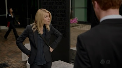 Всю прошлую серию её хвалили црушники за то, как она отлично сработала в Бейруте. Хотя сработала она там хуже некуда - сначала подцепила хвост и отделалась от него с риском для жизни, потом нарушила прописанный сценарий и встретилась с информаторшей, никого не предупредив, а в конце поставила под угрозу всю группу, когда бегала домой к Фатиме за бумагами. А потом еще и ломилась в ЦРУ. Но, может, они просто не хотят её расстраивать, зная, что она может слететь с катушек в любую минуту. Так или иначе, новая группа начинает работать под руководством нового начальника, которого поставил над ней Эстис - Питера Квина. Квин считает, что просто так следить за Броуди не интересно. Ну да, а арестовать его и просто выпытать с помощью стандартных методов и хеви-металла, и вовсе. А Абу Назир явно замышляет новый теракт, потому что надо же ему сейчас чем-то себя занять после того, как Израиль с помощью американцев вдарил по Ирану. Поэтому решено Броуди немного пошевелить, чтобы он поживее забегал. Для этого надо ненавязчиво предъявить ему Кэрри, тогда он заподозрит, что за него опять взялись, и на нервняках сделает какую-нибудь ошибку. А Джессика пока выставила мужа из дома и он съехал в отель, где за ним еще легче следить. Тут надо отметить, что Броуди за день встречается с подозрительными людьми просто уже потому, что мир Homeland населен сплошными выходцами с Ближнего Востока, они тут буквально на каждом углу. Кэрри решено показать ему на выходе из штаб-квартиры в Ленгли для пущего драматического эффекта. Но мало того, что он её увидел и они перекинулись парой слов, мол, она на него больше не обижается, её вылечили, но она еще и намекает, что она тут на секретной работе. То есть, ЦРУ показалось недостаточным, если Кэрри бы сказала Броуди, что просто зашла за справкой о зарплате, а он бы подумал, что она врет и заподозрил бы неладное. Нееет, на его вопрос она ответила, что не может ему рассказывать, это секрет. А в это время в дом к Джессике ломится бывший сослуживец мужа, инвалид и пьяница Лодер. Он еще в прошлых сериях говорил, что Уокер не мог промахнуться и всё это вобще не с проста. А тут он заводит свою обычную песню - "Броуди изменился, он явно ступил на кривую дорожку, они с Уокером работали в паре годами, и раз Уокер стрелял в вице-президента, то Броуди точно в этом замешан". Джессика вызывает Майка, чтобы он забрал пьяного Лодера, и Лодер всё то же самое повторяет ему, а Майк говорит, что Броуди ведет себя странно, что-то тут не так, наверняка за этим стоит ЦРУ. Ройя, hot&sexy, гуляет по всяким административным зданиям, где конгрессмены сидят, встречает Броуди и сообщает ему радостную весть - они прикрыли его следы в Гетисберге. Я тут даже не поняла, что она имела в виду, - они нашли и уничтожили зарытый в лесу труп?! Если Аль-Каиду не смущает, что они рисковали своим главным резидентом для спасения менее важного резидента, то есть, очень хотели спасти Портного, а важный резидент его просто убил (ладно, там случайность и он бы всё равно умер), то не проще ли было убить его самим, а не разводить такую канитель? Но Броуди больше озабочен встречей с Кэрри. И Ройя советует ему возобновить этот контакт, чтобы разузнать побольше. Вечером все участники опергруппы расходятся, и в конторе остаются только Кэрри с Квином, пока дочь Броуди крутит роман с сыном Уолдена и это совершенно неинте