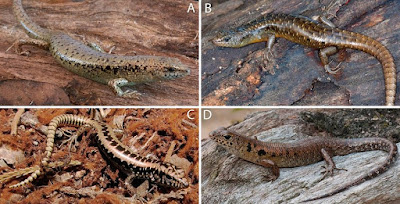 | FIGURE 6. A. Sphenomorphus stellatus (LSUHC 13483) from Bukit Larut, Perak, Peninsular Malaysia (photograph by L. L. Grismer). B. S. preylangensis from Phnom Chi, Preah Vihear Province, Cambodia (photograph by Neang Thy). C. S. annamiticus (LSUDPC 4854) from Mang Canh Village,Kon Plong districts, Kon Tum Province, Vietnam, Vietnam (photograph by RAN). D. S. praesignus (LSUDPC 8002) from Gunung Tebu, Terengganu, Peninsular Malaysia (photograph by L. L. Grismer). |