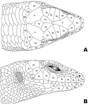 Terminology is adapted from Taylor (1935). AL = anterior loreal, Cs = chinshield; F = frontal, Fn = frontonasal, Fp = frontoparietal, IL = infralabial, Ip = interparietal, M = mental, N = nasal, Nu = nuchal, P = parietal, Pf = prefrontal, PL = posterior loreal, Pm = postmental, Pr = preocular, Prs = presubocular, PT = primary temporal, Psl = postsupralabial, R = rostral, Sl = supralabial, So = supraocular, ST = secondary temporal, TT = tertiary temporal, UPT = upper pretemporal, LPT = lower pretemporal, * = superciliary and # = postsubocular. Illustration by NAP. |
