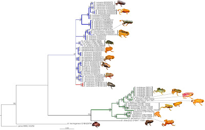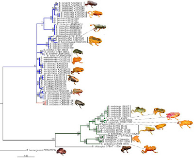 | FIGURE 6. Bayesian Inference tree (lnL = -4368.48) for 16S sequences (999 aligned basepairs, 78 terminals; 2 partitions = for the two fragments: each GTR+G) of species of Brachycephalus. Thicker clades refer to those also found by maximum parsimony. Clade support values include posterior probabilities above branches and parsimony bootstrap below branches. Branches were colored according to their classification into B. pernix (blue), and B. ephippium (green), according to Ribeiro et al. (2015).