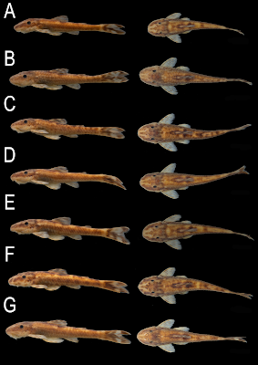 | Fig 5. Parotocinclus nandae, variation in color pattern in alcohol. MCP 54185, paratypes, Brazil, Bahia, Ibicoara, upper Rio Paraguaçu basin: (A) male, 38.1 mm SL; (B) female, 37.8 mm SL; (C) female, 39.5 mm SL, (D) female, 41.2 mm SL; (E) female 41.2 mm SL; (F) female, 41.7 mm SL; and (G) male, 42.0 mm SL. |