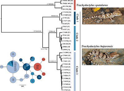 Data for Trachydactylus spatalurus specimens NMP 75147 and NMP 75146 are presented in Table 1. Trachydactylus hajarensis TMHC 2013.10.407, male, 3 km S. of Al-Hamra, Nizwa, Oman (23.057 57.288, 671 m a.s.l.); TMHC 2013.10.408, male, same data as TMHC 2013.10.407; TMHC 2013.10.409, male, surrounding of Jebel Shams Resort, Oman (23.208 57.200, 1983 m a.s.l.). TMHC: Tomas Mazuch Herpetological Collection, Czech Republic |