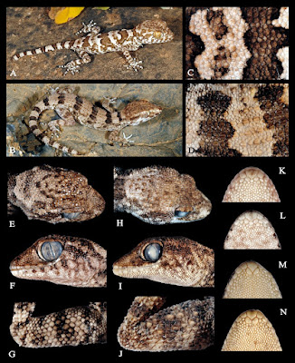 | Trachydactylus spatalurus (Anderson, 1901) & Trachydactylus hajarensis (Arnold, 1980) Fig. 6. Pictures of (a) Trachydactylus spatalurus (NMP 75147, male) and (b) Trachydactylus hajarensis (TMHC 2013.10.407). Close up detail of the dorsal scales of (c) T. spatalurus (NMP 75147) and (d) T. hajarensis (TMHC 2013.10.408). Details of the dorsal side of head (e), lateral side of head (f) and dorsal side of the right hind limb (g) of Trachydactylus spatalurus (NMP 75147); of the dorsal side of head (h), lateral side of head (i) and of the dorsal side of the right hind limb (j) of T. hajarensis (TMHC 2013.10.407). Underside of head (gular region showing the arrangement of mental and postmental scales and chin shields) of (k) T. spatalurus (NMP 75146, male), (l) T. spatalurus (NMP 75147), (m) T. hajarensis (TMHC 2013.10.407) and (n) T. hajarensis (TMHC 2013.10.409).