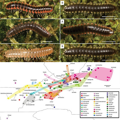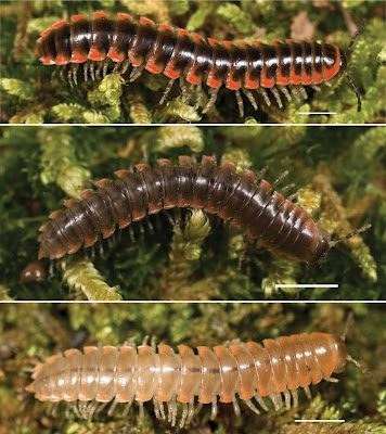 | Nannaria piccolia sp. nov. coloration, A holotype ♂ (VTEC, MPE03809) orange paranotal spots B paratype ♂ (VTEC, MPE03812) white paranotal spots C paratype ♀ (VTEC, MPE03811) orange paranotal spots with orange stripes.
