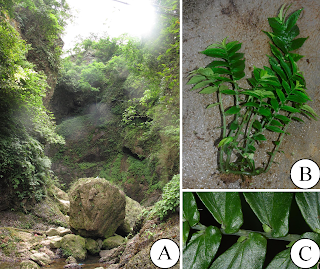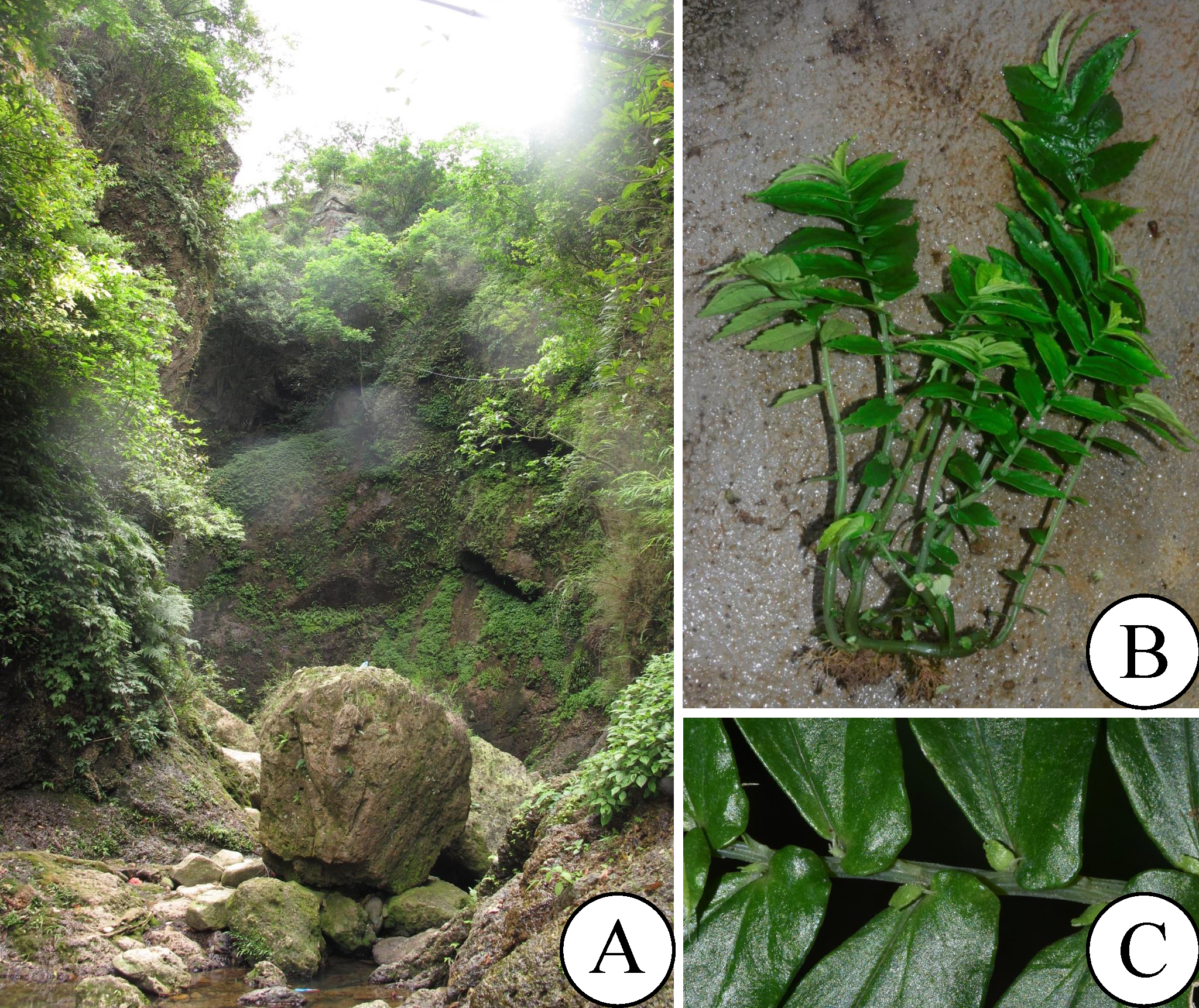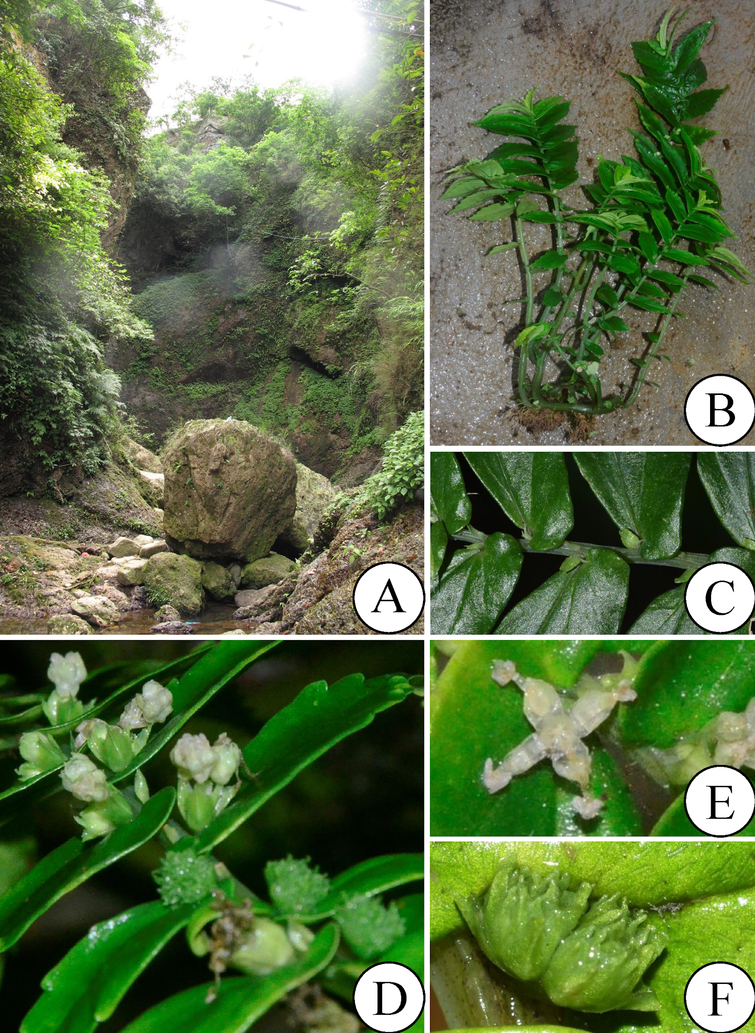 Abstract Elatostema qinzhouense L.F. Fu, A.K. Monro & Y.G. Wei, a new species from Guangxi, China is described and illustrated. Morphologically, E. qinzhouense is most similar to E. hezhouense from which it differs by having smaller size of leaf laminae, fewer and smaller staminate peduncle bracts, longer pistillate peduncle bracts and a larger achene. This result is supported by the molecular evidence. The phylogenetic position of the new species within Elatostema is evaluated using three DNA regions, ITS, trnH-psbA and psbM-trnD, for 107 taxa of Elatostema s.l. (including E. qinzhouense). Bayesian inference (BI) and maximum likelihood (ML) analyses each recovered the same strongly supported tree topologies, indicating that E. qinzhouense is a member of the core Elatostema clade and sister to E. hezhouense. Along with the phylogenetic studies, plastid genome and ribosomal DNA (rDNA) sequences of the new species are assembled and annotated. The plastid genome is 150,398 bp in length and comprises two inverted repeats (IRs) of 24,688 bp separated by a large single-copy of 83,919 bp and a small single-copy of 17,103 bp. A total of 113 functional genes are recovered, comprising 79 protein-coding genes, 30 tRNA genes, and four rRNA genes. The rDNA is 5,804 bp in length and comprised the 18S ribosomal RNA partial sequence (1,809 bp), internal transcribed spacer 1 (213 bp), 5.8S ribosomal RNA (164 bp), internal transcribed spacer 2 (248 bp) and 26S ribosomal RNA partial sequence (3,370 bp). In addition, the chromosome number of E. qinzhouense is observed to be 2n = 26, suggesting that the species is diploid. Given a consistent relationship between ploidy level and reproductive system in Elatostema, the new species is also considered to be sexually reproducing. Our assessment of the extinction threat for E. qinzhouense is that it is Endangered (EN) according to the criteria of the International Union for Conservation of Nature. Elatostema qinzhouense L.F. Fu, A.K. Monro & Y.G. Wei, sp. nov. Diagnosis. Most similar to Elatostema hezhouense from which it differs by the smaller size of leaf laminae (10–45 × 6–15 mm vs. 55–115 × 20–25 mm), fewer and smaller staminate peduncle bracts (1, 1 mm vs. 2, 3.5 mm), longer pistillate peduncle bract (0.900 mm vs. 0.375 mm) and a larger achene (0.86–0.94 × 0.27–0.30 mm vs. 0.6 × 0.25 mm) (see Table 4). Distribution and habitat. Elatostema qinzhouense is known from a single locality in Lingshan County, Qinzhou City, Guangxi, China. E. qinzhouense is likely calcicolous and grows under evergreen broad-leaved forest on limestone hills. Flowering from December to March, fruiting from March to April. Etymology. Elatostema qinzhouense is named after the type locality, Qinzhou City, Guangxi Zhuang Autonomous Region, China. Vernacular name. 钦州楼梯草 (Chinese name). Longfei Fu, Alexandre K. Monro, Tiange Yang, Fang Wen, Bo Pan, Zibing Xin, Zhixiang Zhang and Yigang Wei. 2021. Elatostema qinzhouense (Urticaceae), A New Species from Limestone Karst in Guangxi, China. PeerJ. 9:e11148 . DOI: 10.7717/peerj.11148 |
