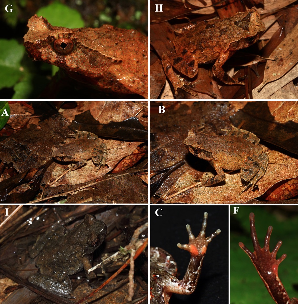 Megophrys ombrophila sp. nov. Messenger & Dahn Etymology. Megophrys ombrophila: Greek: ombros (rainstorm), Greek: philos (that loves, that is fond of), in reference to the species’ propensity for being especially active during and after heavy rainstorms. For an English and Chinese standard name, we are recommending the name Yu Shen Horned Toad/ Yǔ Shén jiǎo chán (雨神角蟾), after the Chinese god of rain. Kevin R. Messenger, Hollis A. Dahn, Yuanrui Liang, Peng Xie, Yong Wang and Changhu Lu. 2019. A New Species of the Genus Megophrys Gunther, 1864 (Amphibia: Anura: Megophryidae) from Mount Wuyi, China. Zootaxa. 4554(2); 561–583. DOI: 10.11646/zootaxa.4554.2.9 |
