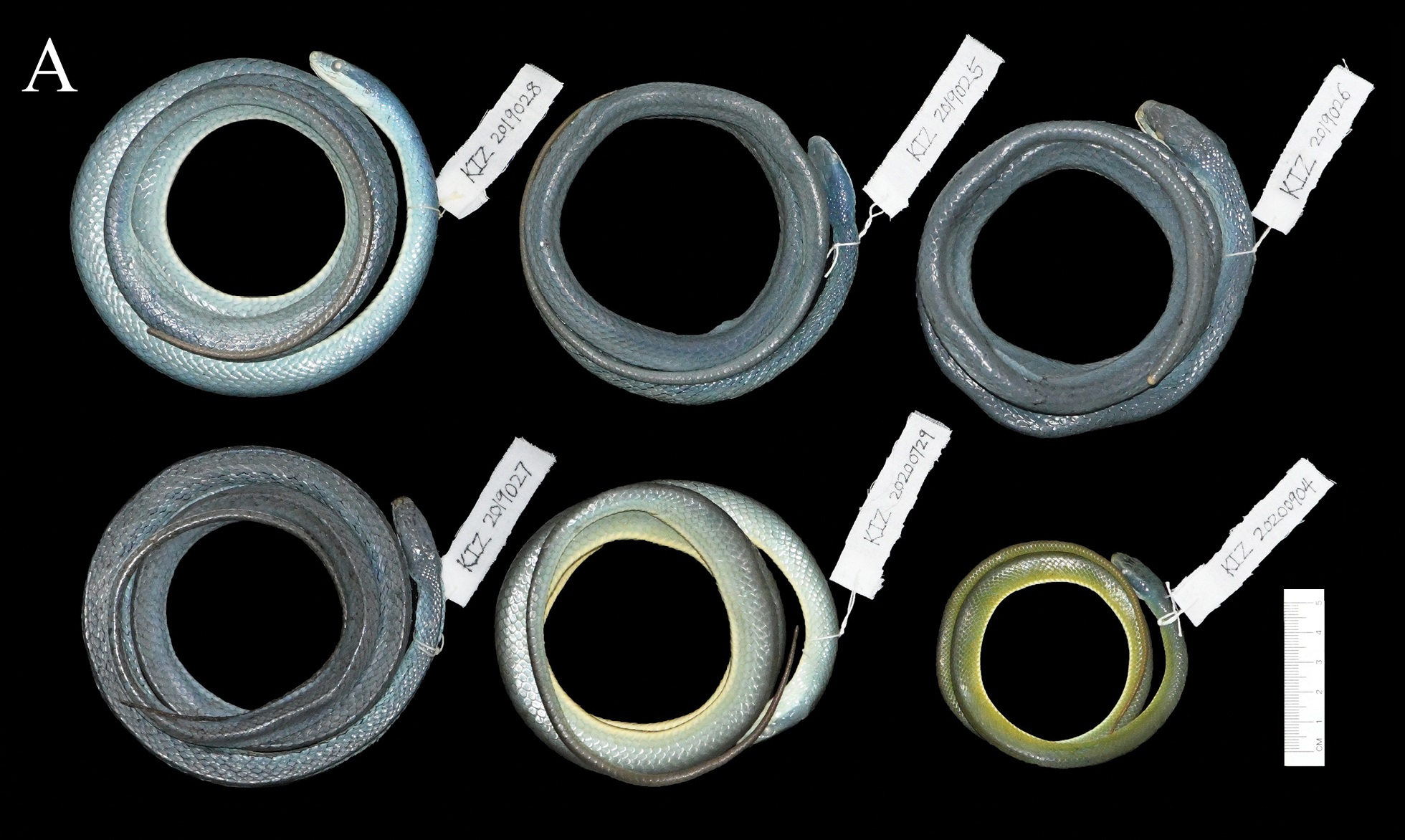 Abstract A new species of the genus Gonyosoma Wagler is described from Yunnan Province, China. The new species closely resembles G. prasinum (Blyth), but it is differentiated from the latter species by the following characters: precloacal plate divided, iris blue and inside of mouth greyish-white in life. Based on phylogenetic analyses of mitochondrial cytochrome b sequence data, the new species is recovered as the sister species to G. prasinum by Bayesian Inference and Maximum Likelihood analyses. The uncorrected pairwise distance between the new species and other species of the genus Gonyosoma ranged from 11.78% to 17.07% calculated using the mitochondrial cytochrome b sequence. This discovery increases the number of Gonyosoma species to seven. Key Words: Htamanthi, morphology, phylogeny, systematics, taxonomy, Yunnan Gonyosoma coeruleum sp. nov. Diagnosis: Body size medium (SVL 656–833mm in adults); body slender, head elongated and distinct from neck; large eyes with round pupil; tail long (23–28% of total length) and slender; dorsal scales in 19-19-15 rows, 7–11 rows of mid-dorsal scales keeled; single preocular; two postoculars; one or two anterior temporals and two or three posterior temporals; 189–202 ventral scales; 89–106 paired subcaudals; precloacal plate divided. Dorsal surface bright green with brownish-yellow tip of tail, iris blue, inside of mouth greyish white; tongue brownish yellow with black tips. Etymology: The specific epithet “coeruleum” is the neutral gender of the Latin adjective coeruleus (a, um) meaning “blue”, and is given in reference to the coloration of the iris of this species. Distribution: Gonyosoma coeruleum sp. nov. is currently known from Xishuangbanna Autonomous Prefecture and Puer City, Yunnan Province, China (Fig. 6), it is probably also distributed in other parts of Yunnan Province and Sichuan, Guizhou, and Hainan Province, China, as well as Southern Myanmar, Thailand, Laos, and Vietnam.