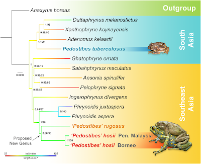 Distribution, morphological, natural history, phylogenetic relationships and genetic divergences and genetic data do not support the current taxonomy that unites South Asian and Southeast Asian tree toads under the common genus Pedostibes. Because the Indian species P. tuberculosus has priority as the type species, we propose that the Southeast Asian lineages (‘P’. hosii, and ‘P’. rugosus) be recognized as a separate genus. One remaining, unresolved issue concerns the generic status of P. kempi and ‘P.’ everetti. Pedostibes kempi has not been collected since its original description and no modern specimens or genetic samples are available for study. ‘Pedostibes’ everetti is phenotypically similar to ‘P’. rugosus and the only discrete morphological character differentiating ‘P’. everetti from ‘P’ rugosus is the absence (vs. presence) of a tarsal ridge. Furthermore, ‘P’. everetti is only known from one juvenile specimen. Based on these limited data, the taxonomic status of these species remains uncertain and additional data will be required to resolve their taxonomic placement. Thus, based on distribution, we tentatively assign P. kempi to the genus Pedostibes and ‘P.’ everetti to the new genus named below, with the caveat that these relationships may need to be re-evaluated when additional data become available. Because the earliest species description of the Southeast Asian group is ‘P.’ hosii, and its only generic synonym, Nectophryne is occupied by a distinct African tree toad lineage, we define and diagnose a new genus for the Southeast Asian clade as follows: