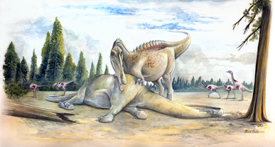 | Fig 5. Reconstruction of the terrestrial paleoenvironmental setting of the Sao Khua Formation, Northeastern Thailand. In the center, a generalized spinosaurid feeds on a sauropod. This trophic relationship is hypothesized based on isolated tooth crowns found in association with a sauropod skeleton [Buffetaut & Suteethorn, 1999]. In the background, a small pack of the ornithomimosaur theropod Kinnareemimus. Both sauropods and ornithomimosaurs (as part of the “herbivorous” theropods) were found to be positively associated with terrestrial paleoenvironments by Butler and Barrett (2008)