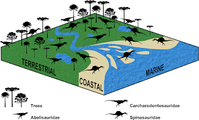 | Fig 4. Schematic illustration of the spatial distribution of Abelisauridae, Carcharodontosauridae, and Spinosauridae throughout coastal and terrestrial paleoenvironments. Spinosaurids seem to have been natural inhabitants of coastal settings, while terrestrial and more inland habitats were shared by them and both abelisaurids and carcharodontosaurids. Note that the number of body icons (not to scale) does not reflect perfectly the relative abundance of these taxa within each paleoenvironment.