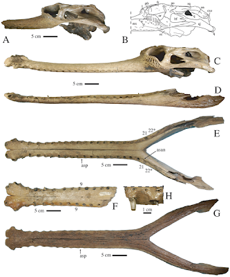 | Figure 4. Skull and mandible of Gavialis cf. bengawanicus from the Early Pleistocene of Khok Sung (Nakhon Ratchasima Province, Thailand). A, right lateral view (mirrored for comparison) of DMR-KS-03-25-23. B, line drawing from the left lateral view of the posterior portion of the skull of DMR-KS-201202-1. C, left lateral view of skull of DMR-KS-201202-1. D, E, G, mandible of DMR-KS-201202-1 left lateral (D), occlusal (E), and ventral (G) views. F, incomplete dentaries (DMR-KS-05-06-22-1) in occlusal view; H, detail of the dentition in lateral view as seen on the maxillary fragment DMR-KS-05-03-08-37.