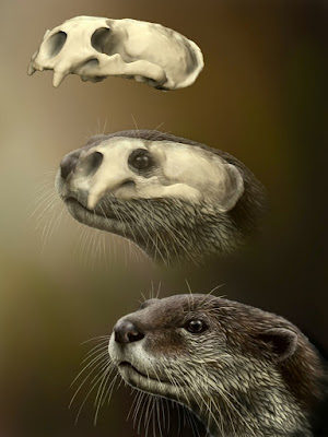 | Fig. 10. Sequential reconstruction of the head of Lutraeximia umbra, gen. et sp. nov., from Pantalla (Italy). From top to bottom: 3D retrodeformed model of the cranium SBAU 337654, reconstructed head and cranium overlapped, life appearance.