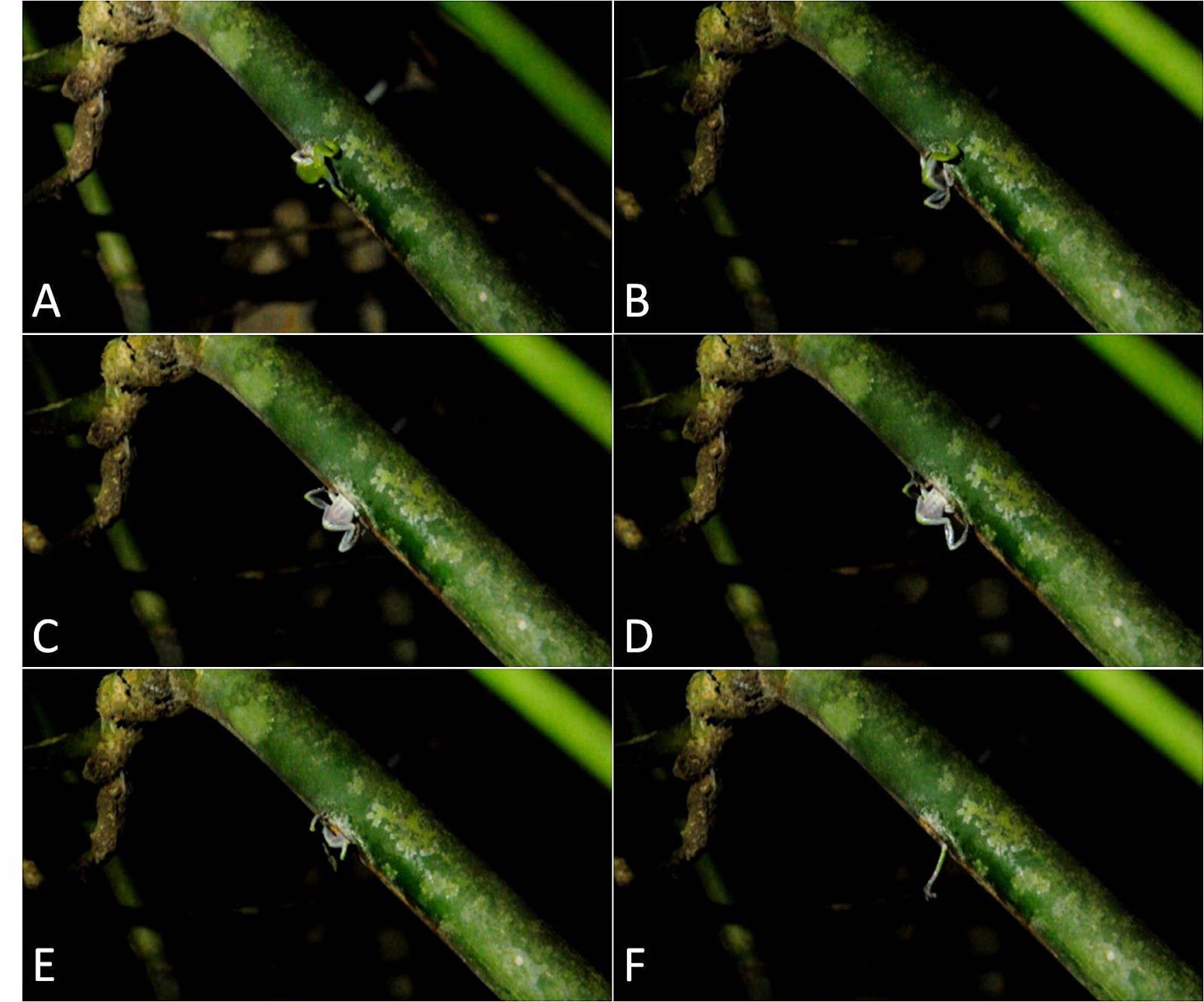 | Figure 3. Snapshots of male R. chalazodes entering the nest cavity inside a bamboo internode. A, male entering by inserting head; B, mid dorsum and forearms inserted; C, forearms used to haul body in; D, forelimbs almost completely inserted; E, anterior portion of body almost entirely inserted, legs remain outside and; F, legs being pulled inside, one-by-one. Entry sequence lasted almost 30 s.