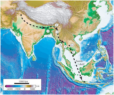 | Figure 12. Hypothetic dispersal route of Gavialis spp. from their ancestral habitat in Indo-Pakistan toward SE Asia through the East Himalayan syntaxis. Definitive isolation of Gavialis population is represented by the mountain barriers separating the Salween and Chao Phraya basins and may have taken place during the latest Pliocene–earliest Pleistocene. 1, Ganges Delta; 2, Bhramapoutre Basin; 3, Irrawaddy Basin; 4, Salween Basin; 5, Chao Phraya Basin; 6, Chi and Mun rivers Basin; 7, Mekong Delta. Stars indicate the Early Pleistocene records of Gavialis in SE Asia (Khok Sung, Thailand and Java, Indonesia).