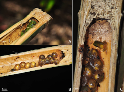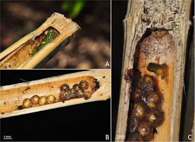 | Figure 4. Inside bamboo internode and nest cavity. A, Adult male with a clutch of five eggs; B, two different aged egg clutches inside one internode, one clutch with seven eggs and another with only four eggs are visible; C, an emerged froglet from a different clutch with seven eggs seen near developing embryos.