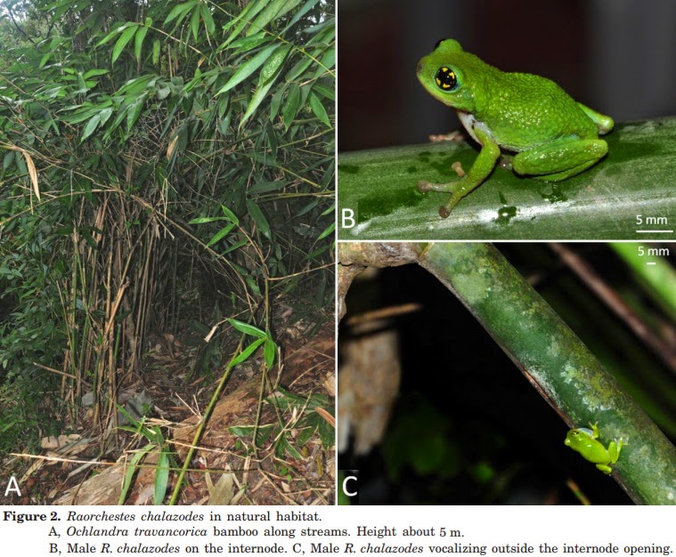 Kadaba Shamanna Seshadri, Kotambylu Vasudeva Gururaja and David Patrick Bickford. 2015. Breeding in Bamboo: A Novel Anuran Reproductive Strategy discovered in Rhacophorid Frogs of the Western Ghats, India. Biological Journal of the Linnean Society. 114(1); 1–11. D OI: 10.1111/bij.12388 Researchers discover for the first time that a rare bush frog breeds in bamboo | 5:13p |
