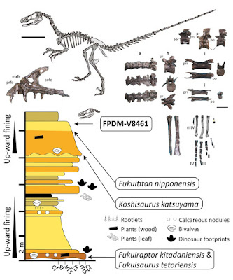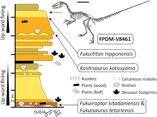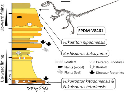 | Figure 1: Skeletal silhouette of FPDM-V8461 and the stratigraphic section of the Lower Cretaceous Kitadani Formation in the Kitadani Dinosaur Quarry.