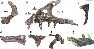 | Figure 2: Cranial skeletal morphology of FPDM-V8461. (a) Partial right premaxilla in lateral view. (b) Partial left maxilla in lateral view. (c) Partial left lacrimal in lateral view. (d) Right frontal in dorsal view. (e) Right postorbital in lateral view. (f) Left squamosal in lateral view. (g) Partial right dentary in lateral view.