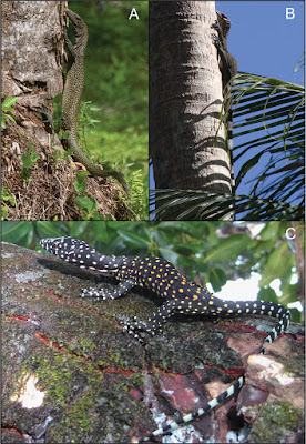 | Figure 3. A–C Images of live Varanus semotus at Nai on Mussau Island. A an adult in its habitat at the outskirts of Nai B an adult basking on the trunk of a palm tree (photos by VW), and C a juvenile (photo by Quetzal Dwyer).