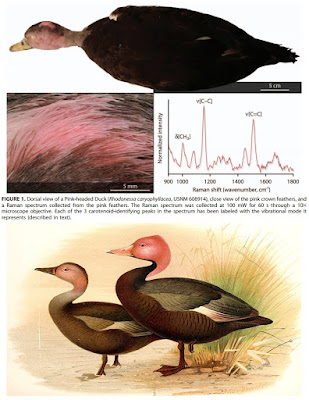 Daniel B. Thomas and Helen F. James. 2016. Nondestructive Raman Spectroscopy confirms Carotenoid-pigmented Plumage in the Pink-headed Duck [ La espectrometría Raman no destructiva confirma la pigmentación con carotenoides del plumaje de Rhodonessa caryophyllacea]. The Auk. 133(2) 147-154. DOI: 10.1642/AUK-15-152.1