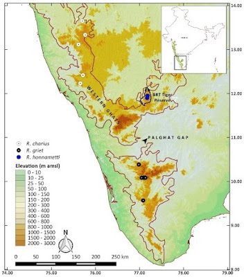 Conservation: There are no immediate threats from human activities to this newly described species as Biligiri Rangaswamy hills is a tiger reserve and enjoys high level of protection. However, in the last one decade, a significant area of the Reserve has been taken over by highly invasive species like Lantana camara (Verbenaceae) and Ageratina adenophora (Asteraceae). On subsequent visits, we have seen several calling males of R. honnametti on Lantana and Ageratina bushes, indicating that this species might have adapted to the presence of these invasive species. However, a systematic research needs to be undertaken to assess the impact of invasive species on R. honnametti.