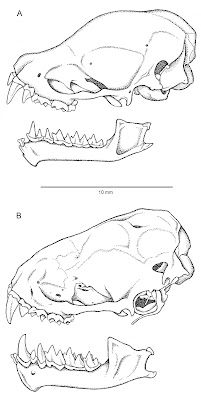 | FIGURE 2. Lateral views of the skull and left dentary of A, the holotype of Synemporion keana (BPBM 159269) compared with B, Lasiurus cinereus semotus (BPBM 184506). Note the difference in the rostral profile between the two species, including the more robust lower jaw dentition in Lasiurus compared with Synemporion. |