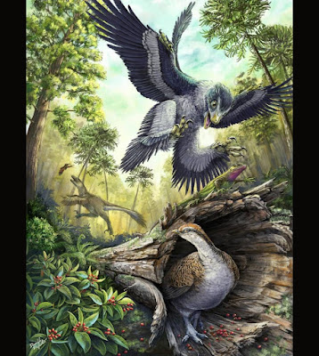 | A small feathered dinosaur swoops down on an unsuspecting lizard while a bird hunts for seeds in this reconstructed slice of life in Alberta 66 million years ago. A new theory suggests that a seed diet helped birds survive the mass extinction event that wiped out all other dinosaurs.