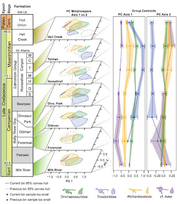 | Figure 2: Tooth Disparity Through Time – A plot of tooth disparity (shape variation) thought the last 20 million years of the Cretaceous from the four groups of bird-like dinosaurs analyzed in this study.