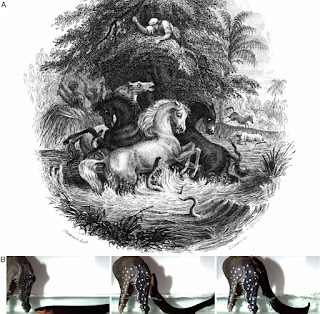 | Fig. 1. Fishing with horses. (A) This illustration depicts the battle between eels and horses observed by Alexander von Humboldt in March 1800. It was published in 1843 as the frontispiece for The Naturalist Library, Ichthyology, Volume V, Part II, the Fishes of Guiana, authored by Robert H. Schomburgk, a friend and protégé of Humboldt’s (3). (B) Example of an eel leaping from the water to shock a simulated predator. LEDs are powered by the eel through a conductive carbon strip taped to the front of the plastic prop.