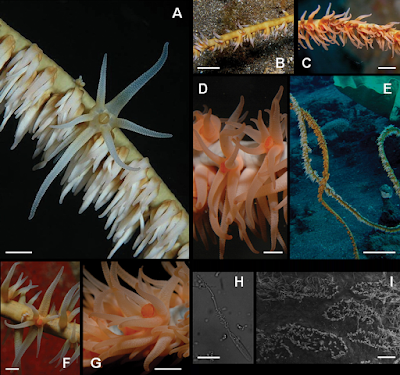 | Figure 4 Underwater photographs of Pseudocirrhipathes mapia. A, macro‐photograph of P. mapia showing an expanded polyp surrounded by resting zooids that do not completely contract their tentacles; B, abpolypar side of a P. mapia colony showing the polyp‐free side of the axis; C, polypar side of a P. mapia colony; D, macro‐photograph of P. mapia showing expanded polyps. Sagittal tentacles are inserted at a lower level; E, two colonies of P. mapia; F, expanded polyp of P. mapia showing the double margin mouth; G, open mouth of an egesting polyp; H, a large discharged basitrich isorhiza, showing the spiny stylet and the incompletely extruded filament; I, patch distribution of nematocysts on the ectodermal surface of the tentacle; J, colony of P. mapia hiding a mimicking Pontonides unciger; K, extremely long sweeper tentacles of a white P. mapia, touching a dead Acropora. Images A, D, F, G, J are courtesy of Massimo Boyer. Scale bars: H, 25 µm. G, I, 1 mm. A, D, F, J, 2 mm. B, C, 5 mm. K, 20 mm. E, 20 cm. DOI: 10.1080/11250000802684104 |