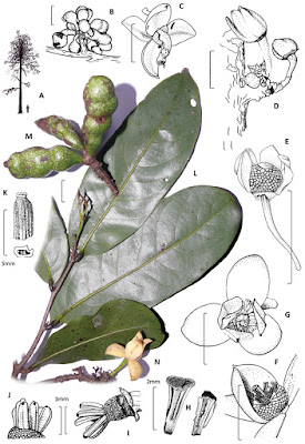 | Figure 2. Polyceratocarpus askhambryan-iringae drawings of A tree architecture B fresh fruits C fresh flower below D fresh ramiflorous flower buds E–F dry and fresh bisexual flower (one petal removed) G fresh bisexual flower above H dried stamens I–J fresh and dry carpels lacking stigmas K dried carpel with stigma, plus photographs of L fresh leaves M fruit and N flower.