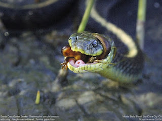 Novel adaptations must originate and function within an already established genome. As a result, the ability of a species to adapt to new environmental challenges is predicted to be highly contingent on the evolutionary history of its lineage. Despite a growing appreciation of the importance of historical contingency in the adaptive evolution of single proteins, we know surprisingly little about its role in shaping complex adaptations that require evolutionary change in multiple genes. One such adaptation, extreme resistance to tetrodotoxin (TTX), has arisen in several species of snakes through coevolutionary arms races with toxic amphibian prey, which select for TTX-resistant voltage-gated sodium channels (Nav). Here, we show that the relatively recent origins of extreme toxin resistance, which involve the skeletal muscle channel Nav1.4, were facilitated by ancient evolutionary changes in two other members of the same gene family. A substitution conferring TTX resistance to Nav1.7, a channel found in small peripheral neurons, arose in lizards ∼170 million years ago (mya) and was present in the common ancestor of all snakes. A second channel found in larger myelinated neurons, Nav1.6, subsequently evolved resistance in four different snake lineages beginning ∼38 mya. Extreme TTX resistance has evolved at least five times within the past 12 million years via changes in Nav1.4, but only within lineages that previously evolved resistant Nav1.6 and Nav1.7. Our results show that adaptive protein evolution may be contingent upon enabling substitutions elsewhere in the genome, in this case, in paralogs of the same gene family.  | Santa Cruz Garter Snake Thamnophus atratus & Rough-skinned Newt Taricha granulosa.