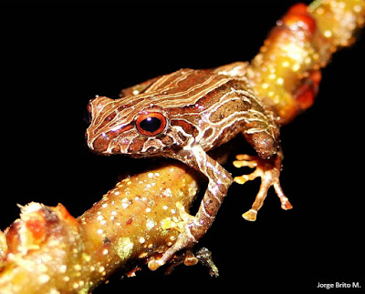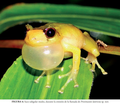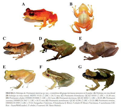 Diego Batallas R. and Jorge Brito M. 2014. A New Species of the Pristimantis lacrimosus Group (Amphibia: Craugastoridae) from Sangay National Park, Ecuador. Pap. Avulsos Zool. (São Paulo). 54(5); DOI: 10.1590/0031-1049.2014.54.05 RESUMEN: Describimos una nueva especie de rana terrestre del genero Pristimantis de tamaño mediano (LRC en machos desde 22.18 a 25.13 mm) descubierta en los bosques nublados de las estribaciones orientales del Parque Nacional Sangay, al centro oriente de Ecuador, a elevaciones de 2750 m. Asignamos a Pristimantis latericius sp. nov., al grupo Pristimantis lacrimosus, el cual se diferencia del resto de miembros de este grupo por presentar tubérculos prominentes en el parpado superior y una coloración rojo anaranjado en el dorso. Las llamadas son cortas, conformadas por una sola nota y dos bandas armónicas. Importantes levantamientos de información faunística se han venido generando en los últimos años en el Parque Nacional Sangay, sin embargo es necesario incrementar estudios que ayuden a documentar la ecología e historia natural de los anfibios, ya que sin lugar a dudas ayudaran a comprender procesos ecológicos. El descubrimiento de esta y otras nuevas especies en este sector, demuestra su importancia biológica confortando al desarrollo de planes de conservación en este importante Patrimonio Natural de la Humanidad.