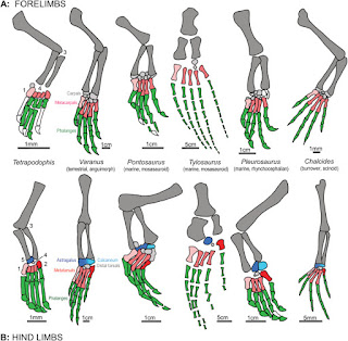 | Fig. 3. (A) Forelimbs and (B) Hindlimbs of Tetrapodophis; a terrestrial squamate (Varanus); a marine dolichosaur (Pontosaurus), a marine mosasauroid (Tylosaurus); and a marine rhynchocephalian (Pleurosaurus). Numbers 1–5 identify highly distinctive limb similarities between Tetrapodophis and marine forms, discussed in the main text. Sources: Tetrapodophis after Martill et al. (2015) and Museum Solnhofen BMMS BK 2-2, Varanus albigularis after University of Alberta Museum of Zoology 947, Pontosaurus kornhuberi after Museo di Storia Naturale di Milano V3662, Tylosaurus proriger after Russell (1967), Pleurosaurus goldfussi after Cocude-Michel (1963), and Chalcides ocellatus after Young et al. (2009) and Field Museum of Natural History 164674. | AbstractThe exquisite transitional fossil Tetrapodophis – interpreted as a stem-snake with four small legs from the Lower Cretaceous of Brazil – has been widely considered a burrowing animal, consistent with recent studies arguing that snakes had fossorial ancestors. We reevaluate the ecomorphology of this important taxon using a multivariate morphometric analysis and a reexamination of the limb anatomy. Our analysis shows that the body proportions are unusual and similar to both burrowing and surface-active squamates. We also show that it exhibits striking and compelling features of limb anatomy, including enlarged first metapodials and reduced tarsal/carpal ossification – that conversely are highly suggestive of aquatic habits, and are found in marine squamates. The morphology and inferred ecology of Tetrapodophis therefore does not clearly favour fossorial over aquatic origins of snakes. Keywords: Squamata; Ophidia; Serpentes; Evolution; Cretaceous; Paleoecology Conclusions
